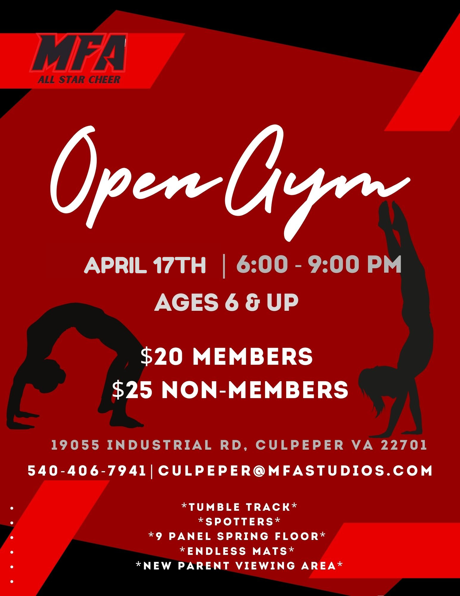 Join us Friday, April 17th from 6:00 PM – 9:00 PM for an action-packed Open Gym at MFA All Star Cheer! Whether you’re perfecting a skill or just looking to have fun, this is the place to be.