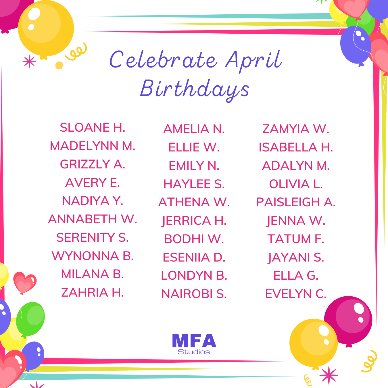 MFA Studios will be closed for Spring Break April 4th - 10th. (Dance, Acro, Tumbling, Karate, and Cheer)