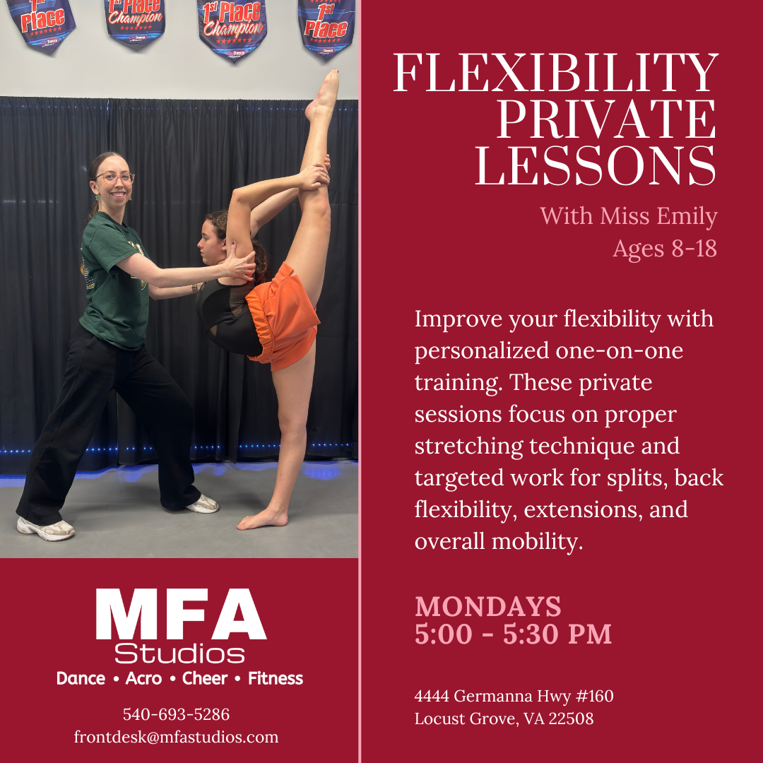 Improve your flexibility with personalized one-on-one training. These private sessions focus on proper stretching technique and targeted work for splits, back flexibility, extensions, and overall mobility. Each lesson is tailored to the dancer's current level and goals while emphasizing safe progress.