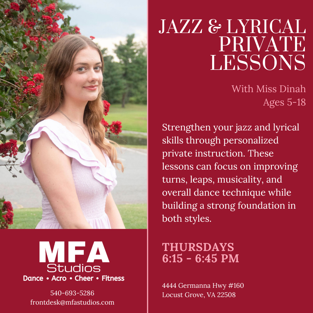Strengthen your jazz and lyrical skills through personalized private instruction. These lessons can focus on improving turns, leaps, musicality, and overall dance technique while building a strong foundation in both styles.
